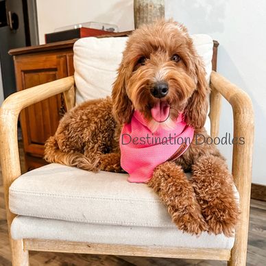 Lady is the daughter of our sweet mama Holly (who is the daughter of Roma) and our stud Bo. She is an F1bb petite Goldendoodle. She is dark red with stark white markings. She is a beauty! She is petite and easy to scoop up in your arms and carry around. She's extremely loving - just like her mama, grandma, and daddy.