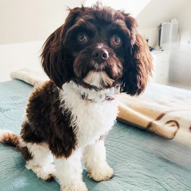 Meadow is an F1 Chocolate Cavapoo (sister to our stud Cooper). Her chocolate coloring is something we've been adding to our program.