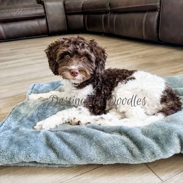 Little Caesar is a multigenerational goldendoodle (approximately 20% retriever, 80% poodle). He has a STRAIGHT coat, great conformation, and white abstract markings. He is "Hot n Ready" to breed and he "delivers" large BEAUTIFUL litters! Perfect genetics!